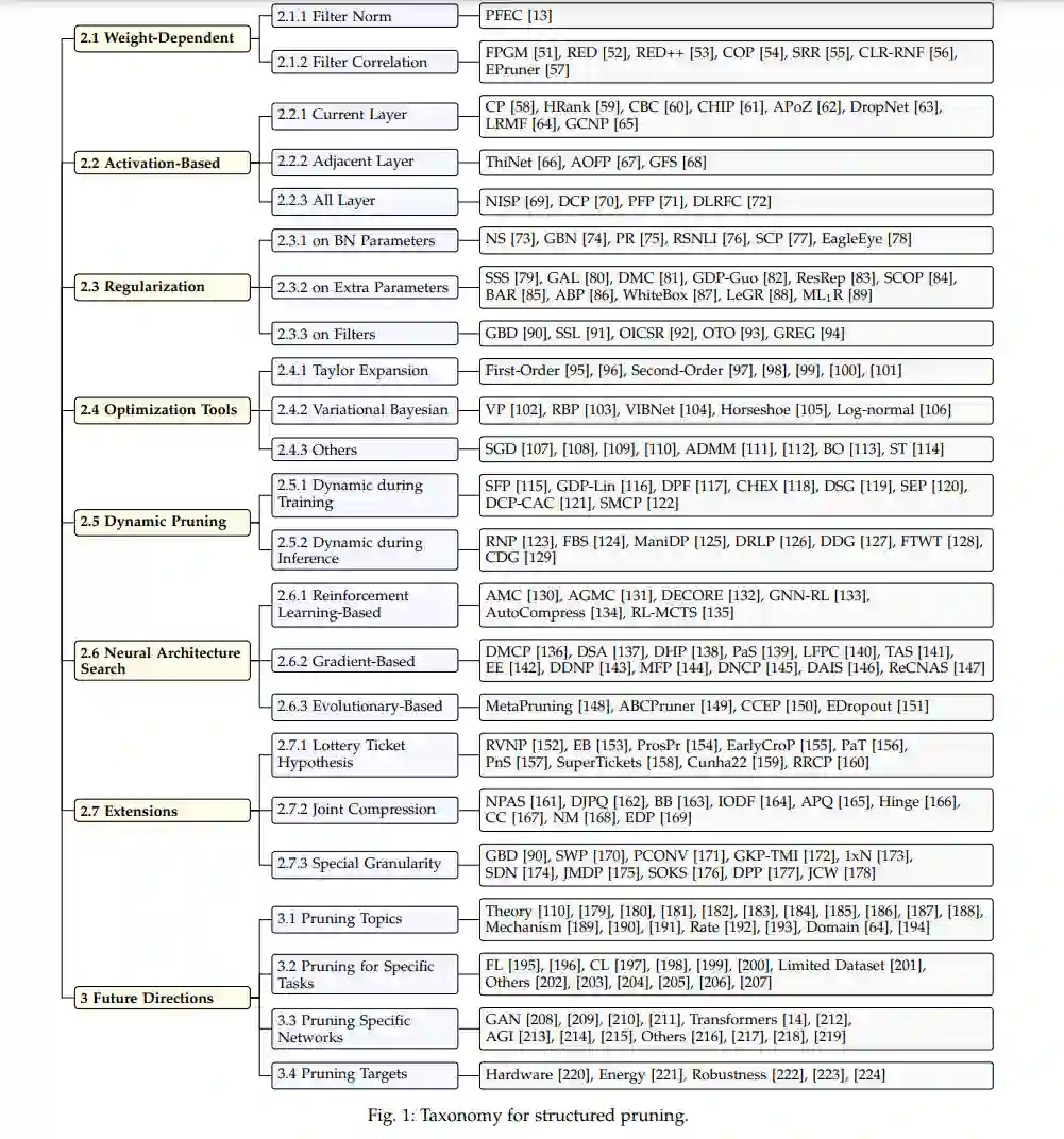 **调研安排如下:在分类法中(图1),将结构化剪枝方法分为不同的类别。**第2节的每一小节对应于一类结构化剪枝方法。大多数方法首先以非结构化的方式开发,然后扩展以满足结构约束。尽管一些研究涵盖了多个类别,但我们将它们放在为本调查服务的最合适的类别中。第三部分介绍了一些潜在的和有希望的未来发展方向。由于篇幅限制,仅对最具代表性的研究进行详细讨论。