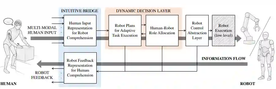 本综述纵览人机协作全领域最新进展,涵盖从人机交互与机人交互抽象层(常称为直观桥梁),到自适应任务规划、动态角色分配及高层控制抽象。它着重指出各层关键方法论挑战,刻意聚焦认知与决策层面而非特定应用实现。本文同时勾勒新兴研究方向,旨在培育更自然、强韧与高效的人机伙伴关系。尽管综述聚焦认知与决策层,但未涉及机器人执行(底层控制)层。为求完备,建议读者参阅全面覆盖机器人底层控制策略的文献(4,5,6)。