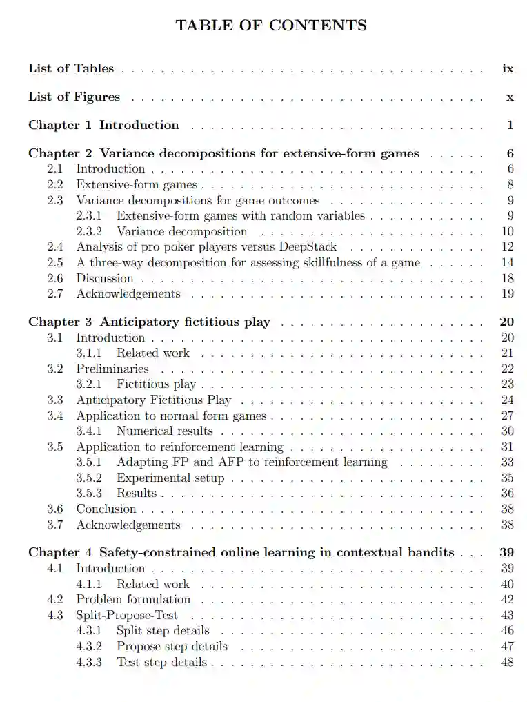 在第二章(广义形式游戏的方差分解)中,我们采用了一种常见的统计工具,并为广义形式游戏开发了一个版本,广义形式游戏是一种具有离散步骤和部分可观察性的游戏的一般模型,包括国际象棋和扑克这些特殊情况。这个工具就是方差分解,它在统计学中被用来量化感兴趣的结果中的变化来源。游戏的方差分解允许用户将游戏结果的变化归因于不同的玩家和机会,使分析游戏的新方法可能对赌博法或游戏设计产生影响。具体来说,我们推导出一个封闭式表达式,并估算出可归因于单一玩家或机会的广义游戏结果的方差。我们分析了扑克牌,发现发牌的随机性对每一手牌的结果的影响小得令人吃惊。我们简要地评论了这一想法的延伸,它可以用来测量游戏的其他有趣的属性。本章是Cloud和Laber(2021)的翻版,稍作修改。