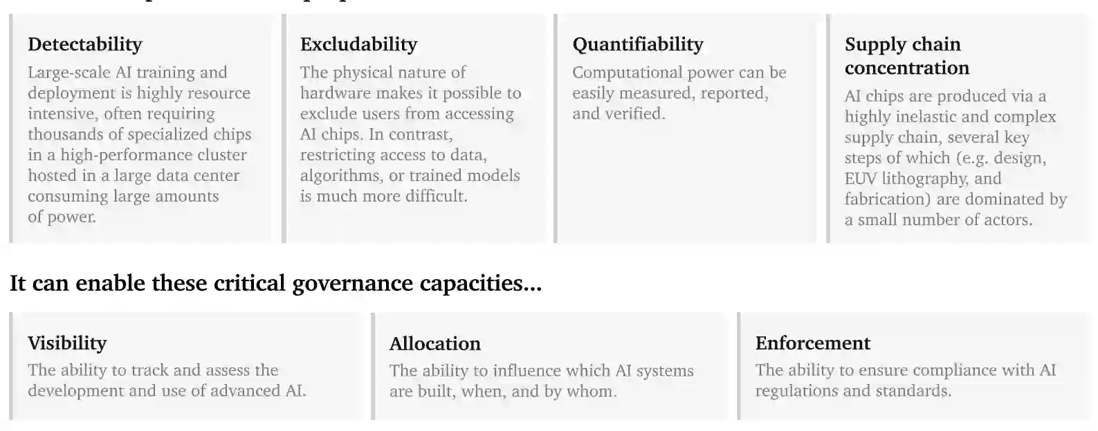在第 3 节 "为什么计算治理对决策具有吸引力 "中,将解释计算的特点,这些特点使其成为人工智能治理的一个有吸引力的工具。这源于计算对前沿模型的独特重要性,以及计算作为一种治理策略所具有的增强功效的若干特性。
