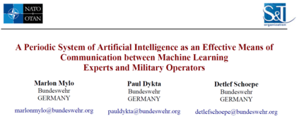 在这里,我们提出了一个软件项目,以讨论三个层次的抽象,区分人工智能软件解决方案的不同颗粒度的信息交流。虽然最低级别的抽象过于复杂,无法创建一个标准化的词汇表,但最高级别的抽象对于许多问题案例来说过于粗糙,无法设计一个合适的算法。然而,正如我们将展示的那样,这种最高级别的抽象是很重要的,因为它是军事操作人员和人工智能专家之间信息交流的最佳级别。最高级别的抽象是由一个平滑的人工智能模式表示的,称为人工智能的周期表(PTA)。我们提出了一个基于PTA的新型指导性工作流程,以支持军事人员和人工智能专家之间的交流,从而利用自动化工作的成果。我们将表明,PTA非常适合作为军事操作人员和机器学习专家之间的交流手段。在未来的工作中,我们可以研究现有的PTA是否应该被改进,特别是在安全部队的要求方面。
