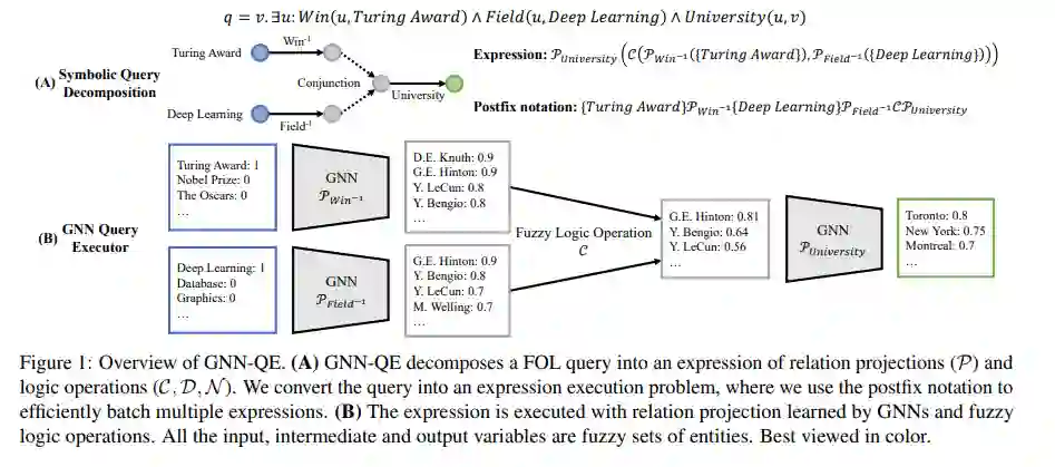 在知识图谱上回答复杂一阶逻辑(FOL)查询是多跳推理的基础任务。传统的符号方法遍历完整的知识图谱来提取答案,为每一步提供了良好的解释。最近的神经方法学习复杂查询的几何嵌入。这些方法可以推广到不完整的知识图谱,但其推理过程难以解释。在本文中,我们提出了图神经网络查询执行器(GNNQE),这是一种神经符号模型,它兼有这两种方法的优点。GNN-QE将一个复杂的FOL查询分解为模糊集上的关系投影和逻辑运算,为中间变量提供了可解释性。为了对缺失环节进行推理,GNN-QE采用知识图谱补全的图神经网络来执行关系投影,并用产品模糊逻辑对逻辑操作进行建模。在3个数据集上的广泛实验表明,GNN-QE在回答FOL查询方面比以前的最先进的模型有显著的改进。同时,GNN-QE可以在没有明确监督的情况下预测答案的数量,并对中间变量提供可视化。