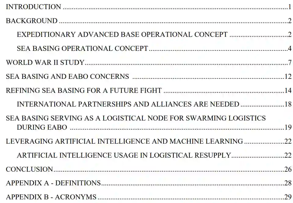 在部署和开展分布式海上作战时,速度至关重要。美海军陆战队新提出的远征先进基地行动(EABO)概念需要可扩展的部队来建立和移动 EAB 的位置,以利用对手的弱点。此外,为使多个 EAB 支持作战行动,需要修订后勤概念,以满足持续性和机动性的要求。这种修订后的概念将允许多个远征基地同时存在,并有能力迅速将它们机动到具备打击敌人能力的重要地理位置。在进行分布式海上作战时,由于缺乏机动性、灵活性、杀伤力以及对反舰导弹和水雷等反介入/区域拒止(A2/AD)系统的防护,军方一直使用的传统后勤流程将不足以支持这些远征先进基地。