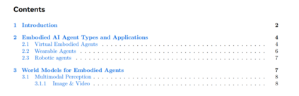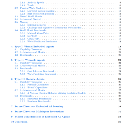 具身人工智能(Embodied AI)智能体是一类具备视觉、虚拟或物理形式的人工智能系统,使其能够与用户及其物理或数字环境进行学习与交互。这些具身 AI 系统必须具备在环境中进行有意义感知与行动的能力,因此也就要求它们对所处物理世界有深入理解。相比之下,仅存在于网络中的无形智能体并不具备具身性,而那些依靠遥控或预编程指令运行的机器人或无人机,也缺乏真正智能体所需的自主性与适应性。 可穿戴设备的独特之处在于:它们集成了能够感知物理世界并执行动作的 AI 系统,这种“感知—行动”的协同机制使得从用户视角出发,可穿戴智能体也具备具身性,模糊了人机边界。正如哲学家梅洛-庞蒂(Maurice Merleau-Ponty, 1945)所言:“我不是在我的身体里,我就是我的身体”,这强调了身体并非仅是思想的容器,而是存在本身不可分割的一部分。这一观点与具身智能体的理念密切相关,即智能体的身体与其环境共同构成其认知过程的重要组成。基于此,我们提出一个具身智能体框架,核心在于世界建模(World Modeling),使智能体能够以更复杂、更类人的方式推理与交互。 具身性在当前 AI 与机器人研究中主要有两个作用:(1)物理交互:使 AI 系统能够通过直接动作(如机器人智能体)或感知环境(如可穿戴智能体)与物理世界互动;(2)增强人机交互:研究表明,具身智能体能够提升用户的信任感(Winata et al., 2017; Fung et al., 2018; Shridhar et al., 2024)。此外,具身智能体还有一个日益受到关注的潜力方向:(3)类人的学习与发展方式——通过模拟人类的丰富感官体验,从而实现更直觉、类人的学习过程(Dupoux, 2018; Radosavovic et al., 2023)。 构建一个能自主学习、能够与人类和现实世界互动,并在个人与职业生活中提供帮助的 AI 系统,始终是人工智能发展的目标。从最初基于规则的聊天机器人,到 AI 客服,再到虚拟助手,每一代 AI 助手都具备更强的能力。线上 AI 智能体的出现是这一演化的最新阶段。与此同时,AI 的具身化也展现出多样形态,从具身对话代理(Cassell, 2001),到可穿戴设备(Alsuradi et al., 2024)、机器人(Mon-Williams et al., 2025),再到类人机器人(Cao, 2024)。每种具身形式面向不同的任务与应用场景,具备各自独特的能力需求,同时也共享一些核心能力。 不同于以往的 AI 助手,现代 AI 智能体更具自主性,能自主规划多步骤任务,决定所需的外部资源,并判断需协作的其他智能体,能够根据用户显式的请求或上下文隐含的信息理解用户需求。具身智能体还需为用户执行或协助用户执行实际动作,这对其推理与规划能力提出了更高要求。这种“感知世界并据此规划行动”的能力,正是世界建模的核心(LeCun, 2022)。 此外,智能体应能够与用户进行对话,以便在需求不明确或情境发生变化时澄清意图或确认信息。未来,智能体还需能与多个用户及其他智能体进行协作交互。这要求人机互动具备表达性、社会敏感性与情境适应性——换言之,智能体需要理解用户的“心理世界模型(mental world model)”。为支撑物理与心理世界的建模、推理与规划,具身智能体还需具备短期与长期记忆能力。 AI 助手演化为 AI 智能体,很大程度上得益于大语言模型(LLM)与视觉语言模型(VLM)的进展。开发者通过对 LLM 和 VLM 进行提示调控(prompting),构建了具身化的虚拟智能体,如虚拟化身(Cherakara et al., 2023)、智能眼镜、虚拟现实设备(Pan et al., 2024)以及机器人平台(Brohan et al., 2023;Tong et al., 2024)。这些 LLM 不仅在自然语言理解与生成方面表现优异,经过 RLHF 微调后,还具备了更强的指令遵循能力,甚至展现出零样本完成多任务的能力,无需专门为某一任务设计训练。伴随全球数百万用户的广泛使用,从最初的新奇感迅速转向对“能够辅助完成任何任务”的现实期待。 智能眼镜(如 Meta Glasses)使用户可以通过设备摄像头获取视觉输入、通过麦克风提供语音输入,并接入 AI 智能体(如 Meta Multimodal AI),尽管目前尚未能充分获取环境中的听觉线索。LLMs 与 VLMs 被用于实现感知、推理与规划功能,推动了情境感知 AI(Contextual AI)的发展(Erdogan et al., 2025)。VLMs 可通过指令调优实现逐步规划(Kim et al., 2024),而机器人也可在 LLM 提示下执行任务(Ahn et al., 2022)。 然而,生成式模型也存在一个核心缺陷,即其模型规模效率低下。它们擅长生成下一个 token 或像素,适用于创意任务,但往往包含大量冗余细节而缺失对推理与规划而言至关重要的信息。而推理与规划能力正是 AI 智能体的根本。因此,为提高具身 AI 的准确性与效率,我们提出采用一种基于多模态感知进行推理与行动预测的世界建模方法。 本文首先综述不同类型智能体及其应用场景,接着介绍我们为具身智能体提出的世界建模框架,其中包括感知机制、物理与心理世界建模、记忆系统、以及行动与控制策略。我们讨论了基于生成式模型的世界建模方法,同时也探讨了更高效且更可信的预测式世界模型(predictive world models)替代方案。接下来,我们将分别介绍三类具身智能体:(1)虚拟具身智能体;(2)可穿戴智能体;(3)机器人智能体,并在每一部分中列举现有评测基准与未来研究方向。最后,我们描绘了具身学习的未来愿景,以及由多个智能体协同合作的“智能体家族(Family of Agents)”。文章最后还探讨了两个关键伦理问题:隐私与安全,以及拟人化(Anthropomorphism)。
