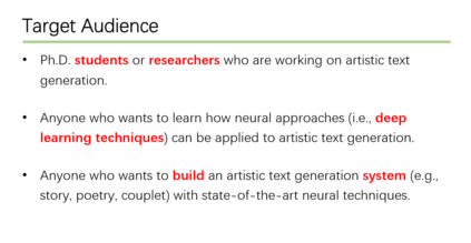 简介: 文本生成和自动书写已逐渐成为人工智能界的前沿之一。 为了促进文本生成的发展,我们在本教程中总结了现有的研究并概述了其技术实现。 具体来说,我们专注于创意和艺术写作的最新进展和趋势,包括故事,诗歌和对联的体裁。
