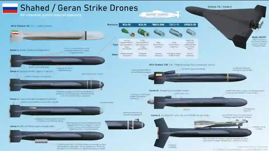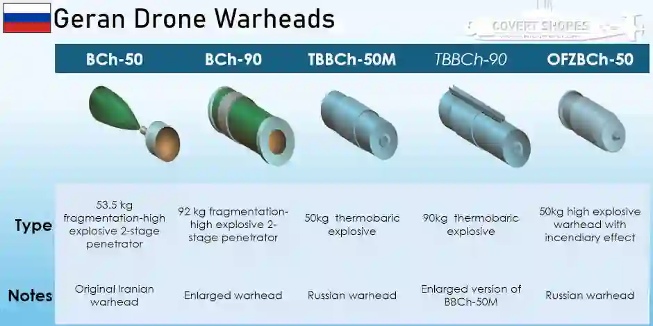 上面的视觉指南展示了主要可观察到的变体。在通信和导航方面还有更多变体,包括使用乌克兰移动电话网络和美国“星链”卫星通信。俄罗斯还开发了额外的战斗部,这些只有在打开机体残骸时才可见。