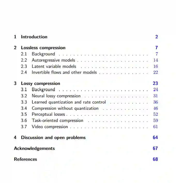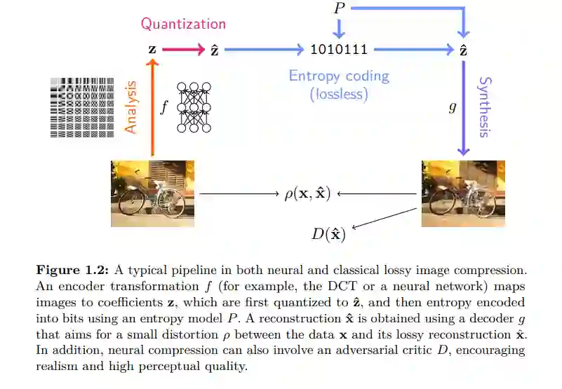 概述。本章主要由两个部分组成,无损压缩(第2节)和有损压缩(第3节),后者依赖前者来压缩数据的有损表示(见图1 - 2)。我们首先回顾基本编码理论(第2.1节),并学习如何在熵编码的帮助下将无损压缩问题转化为学习离散数据分布。为了在实践中工作,我们使用生成建模的工具分解潜在的高维数据分布,包括自回归模型(第2.2节)、潜变量模型(第2.3节)和其他模型(第2.4节)。每个模型类对不同的熵编码算法的兼容性不同,并且在压缩比特率和计算效率之间提供了不同的权衡。有损压缩引入了额外的要求,最常见的是重构的失真,基于此,我们回顾了经典的率失真理论和算法,如矢量量化和变换编码(第3.1节)。介绍了神经有损压缩作为变换编码的自然扩展(第3.2节),讨论了量化表示的端到端学习所需的技术(第3.3节),以及试图绕过量化的有损压缩方案(第3.4节)。在简要回顾视频压缩(第3.7节)之前,探讨了其他要求,如重建的感知质量(第3.5节)和学到的表示对下游任务的有用性(第3.6节)。最后,在第4节中总结了神经压缩的挑战和开放问题,这些问题可能会推动其未来的进展。