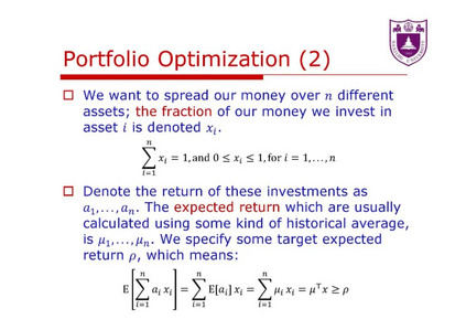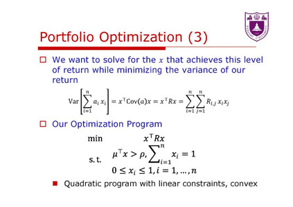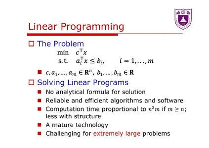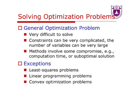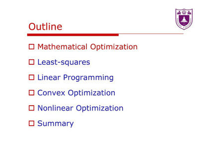 Lecture 1 Introduction Lecture 2 Mathematical Background Lecture 3 Convex Sets Lecture 4 Convex Functions I Lecture 5 Convex Functions II Lecture 6 Convex Optimization Problems I Lecture 7 Convex Optimization Problems II Lecture 8 Duality I Lecture 9 Duality II Lecture 10 Applications Lecture 11 Unconstrained Minimization I Lecture 12 Unconstrained Minimization II