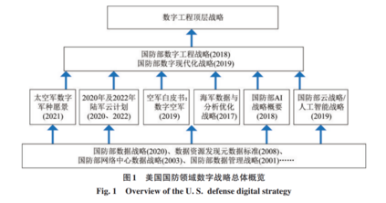 数字化转型是军备转型的战略需求,也是军事理念变革的重要保证,更是智能化技术条件下打赢未来战争不可或缺的一个重要环节。为持续保持战争优势,美军在第四次工业革命浪潮的冲击下积极推进数字化转型。本文分析了美军数字化转型的必要性、发展目标、意义和实施途径,并从标准规范建立、数据模型构建、人员数字化素养等方面提出了推进我国军队数字化 转型的具体措施。 随着量子计算、生物技术、人工智能、机器人技术 和纳米技术等多领域的技术突破,第四次工业革命利 用数字化重塑工业和社会模式,以前所未有的方式推 动军事领域变革。虽然战争的本质并未改变,但是军 事组成要素以及协作关系发生了颠覆性改变。首先, 数字技术、信息技术、物理技术等有机融合,战场指控 链、杀伤链、供应链、保障链等智能化水平大幅提升; 其次,各学科、领域不断交叉扩维,致使战略规划、作 战设计、武器装备研制趋于一体化;最后,深度学习技 术、大数据分析技术、机器技术、无人自主系统技术等 正在推动战争形态趋向无人化、自主化、智能化[1] 。为 适应第四次工业革命时代的变化,美军积极推动数字 化转型工程,这对提升美军战斗力和保障国家安全具 有重要意义。 美军数字化转型最早由美国国防部于 2003 年提 出,《美军转型计划指南》[2] 中强调将美军从一支适应 打机械化战争的军队,建设成为一支适应打网络中心 战的军队。2018年6月,美国国防部正式对外发布《国 防部数字工程战略》[3] ,将数字工程定义为一种集成的 数字方法,明确了数字工程的发展目标,即数字工程 战略旨在推进数字工程转型,将国防部以往线性、以 文档为中心的采办流程转变为动态、以数字模型为中心的数字工程生态系统,完成以模型和数据为核心的 范式转移。2019年7月12日美国国防部又发布了《国 防部数字现代化战略》[4] ,进一步为美军未来数字化转 型指明了发展方向。同年 7 月 19 日,美国空军发布 《数字空军白皮书》[5-7] ,提出以数字工程等敏捷方式变 革采购流程,打造“数字空军”。2020年6月,空军装备 司令部启动为期两年的“数字战役”,开始系统地推进 数字工程转型。2021 年 6月,美国空军设立数字转型 办公室,加速数字化转型进程。美海军陆战队于2020 年形成了《美海军和海军陆战队数字工程战略》[8] ,以 美国国防部的 5 个重点建设领域为蓝本提出建设方 案。美国陆军于2010年初步建成数字化陆战场,2021 年10月,美国陆军首席信息官办公室又先后发布了两 份数字化转型相关文件《陆军数字化转型战略》[9] 和 《陆军统一网络计划:启用多域操作》[10] ,旨在指导美 国陆军的数字化转型工作,使之更好地适应数字化战 争和多域作战[11] ,并计划于2028年具备单一战区多域 作战能力,2050 年建成陆海空天一体化数字化战 场[12-13]。美国国防领域数字战略总体概览如图 1 所示。