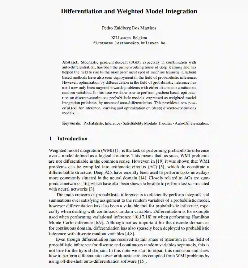 随机梯度下降(SGD),特别是与自动微分相结合一直是深度学习的主要工作,并帮助该领域上升到机器学习最突出的位置。基于梯度的方法在概率推理领域也得到了应用。然而,迄今为止,概率推理领域的微分优化仅针对离散或连续随机变量的问题。在这篇笔记中,我们展示了如何执行基于梯度的优化离散连续概率模型,表示为加权模型积分问题,通过自动微分。这为(深度)离散-连续模型的推理、学习和优化提供了一个新的强大工具。