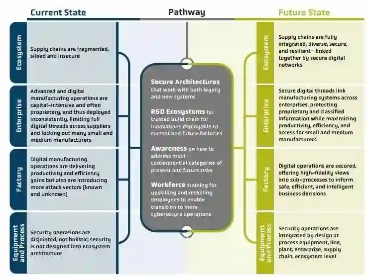 **CyManII路线图**CyManII路线图概述了未来五年美国制造业网络安全的广泛愿景,直接针对供应大型生产行业的中小型制造商、大型制造商以及原始设备制造商。路线图旨在通过使美国制造商成为世界上最安全的网络,为行业转型提供一条稳健和积极的途径。路线图主要分为以下几个部分:**2.1 安全数字制造**美国大部分制造商都在部署先进的、可快速提高效率的制造和数字技术,为此,CyManII将安全制造的创新方法与对网络威胁的认识相结合,将网络风险管理融入制造流程层面,并以此推动美国制造业走向安全数字制造的未来状态。然而,随着先进制造向集成流程、企业、供应链和生态系统的数字线程发展,网络风险的性质和复杂性急剧增加。下图显示了网络安全、高效数字制造两者之间的路径的现状、未来状态和CyManII研究主题促成因素。