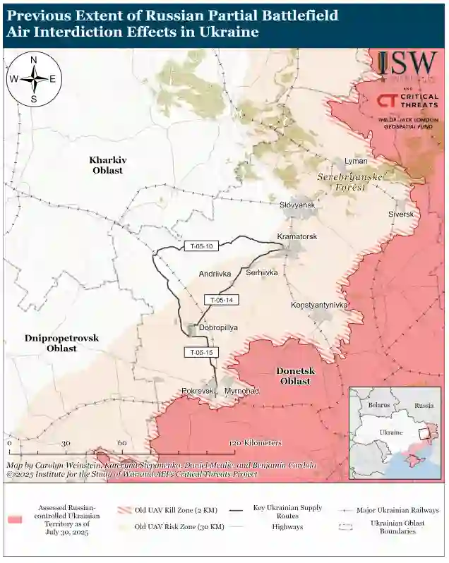 俄军正运用战术无人机对乌军地面交通线(GLOCs)实施有效战场封锁,助推其在乌东地区的推进。BAI本质是通过打击前线近后方目标来短期影响战场行动[3],关键目标涵盖道路、铁路、桥梁(支撑GLOCs的基础设施)、指挥所、弹药库、集结区及训练场等。简言之,BAI旨在切断敌军维持战场运作所必需的物流通道与设施。乌军人员与分析人士指出:俄军早在2025年冬春季节即开始沿全线系统化使用第一人称视角(FPV)无人机与巡飞弹药打击乌军GLOCs及关键目标,为其2025夏季攻势有效实施物流封锁[4]。乌方情报显示俄军此前仅将战术无人机用于战场支援,现已将其作战范围扩展至乌军近后方区域[5]。近期俄军在利曼、塞弗尔斯克、康斯坦丁诺夫卡、波克罗夫斯克及新帕夫利夫卡方向的推进,很可能得益于新型FPV无人机与巡飞弹药的有限BAI效果。