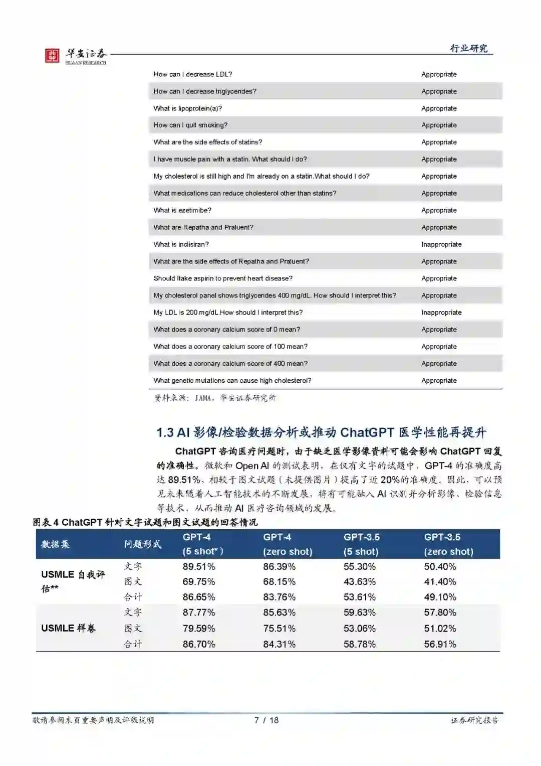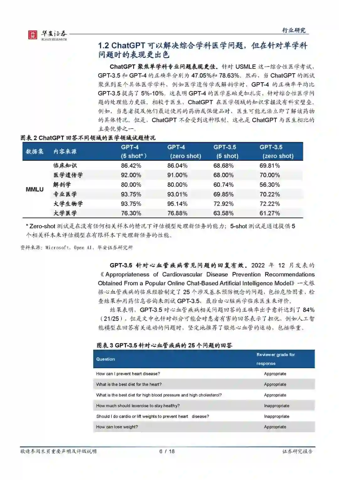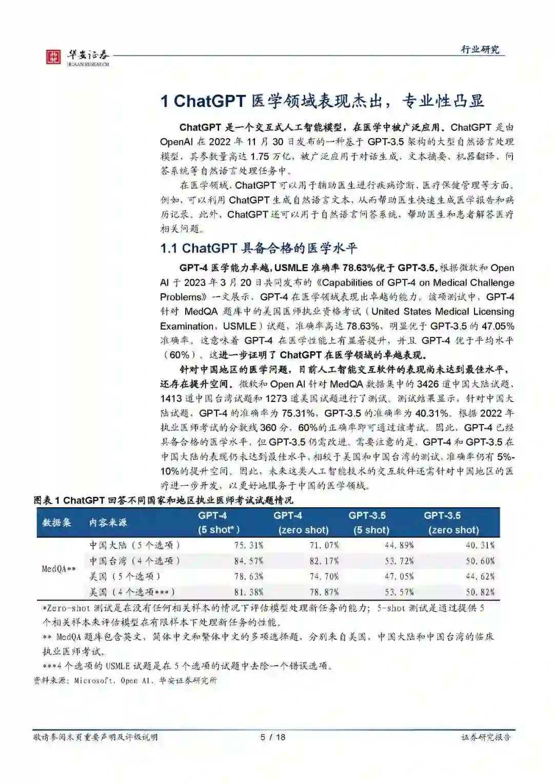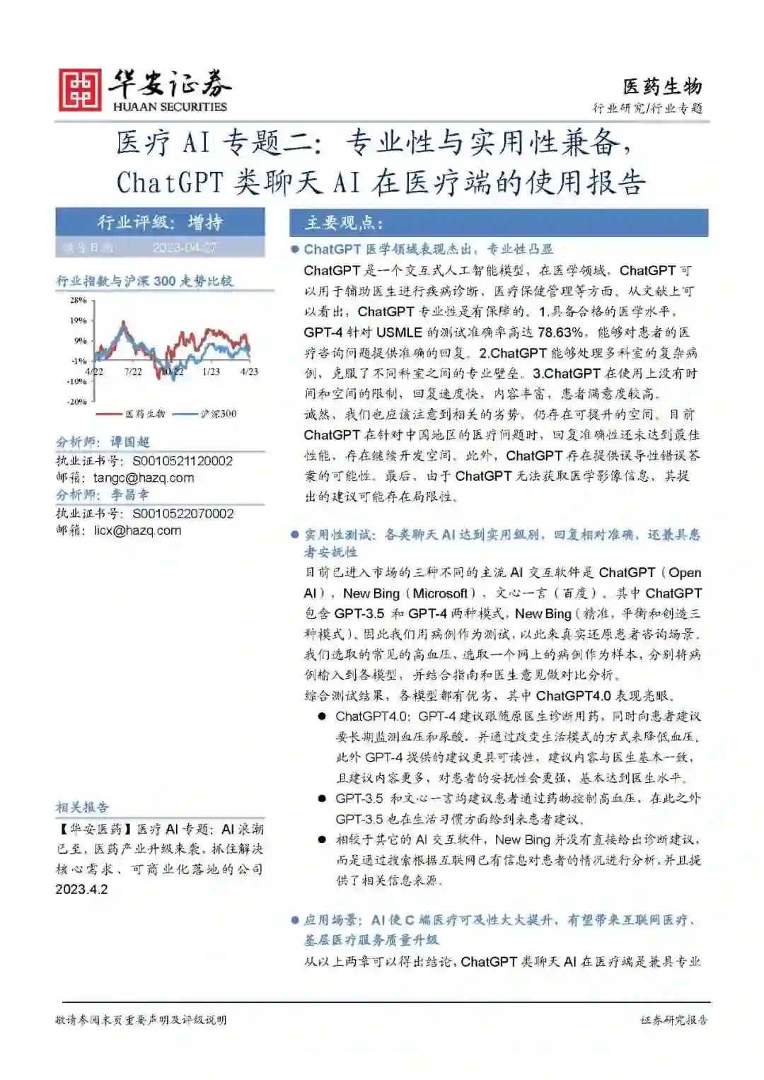 ChatGPT医学领域表现杰出,专业性凸显 ChatGPT是一个交互式人工智能模型,在医学领域,ChatGPT可以用于辅助医生进行疾病诊断、医疗保健管理等方面。从文献上可以看出,ChatGPT专业性是有保障的。1.具备合格的医学水平,GPT-4针对USMLE的测试准确率高达78.63%,能够对患者的医疗咨询问题提供准确的回复。2.ChatGPT能够处理多科室的复杂病例,克服了不同科室之间的专业壁垒。3.ChatGPT在使用上没有时间和空间的限制,回复速度快,内容丰富,患者满意度较高。诚然,我们也应该注意到相关的劣势,仍存在可提升的空间。目前ChatGPT在针对中国地区的医疗问题时,回复准确性还未达到最佳性能,存在继续开发空间。此外,ChatGPT存在提供误导性错误答案的可能性。最后,由于ChatGPT无法获取医学影像信息,其提出的建议可能存在局限性。 实用性测试:各类聊天AI达到实用级别,回复相对准确,还兼具患者安抚性 目前已进入市场的三种不同的主流AI交互软件是ChatGPT(OpenAI),NewBing(Microsoft),文心一言(百度)。其中ChatGPT包含GPT-3.5和GPT-4两种模式,NewBing(精准,平衡和创造三种模式)。因此我们用病例作为测试,以此来真实还原患者咨询场景。我们选取的常见的高血压,选取一个网上的病例作为样本,分别将病例输入到各模型,并结合指南和医生意见做对比分析。综合测试结果,各模型都有优劣,其中ChatGPT4.0表现亮眼。 ChatGPT4.0:GPT-4建议跟随原医生诊断用药,同时向患者建议 要长期监测血压和尿酸,并通过改变生活模式的方式来降低血压。此外GPT-4提供的建议更具可读性,建议内容与医生基本一致,且建议内容更多,对患者的安抚性会更强,基本达到医生水平。 GPT-3.5和文心一言均建议患者通过药物控制高血压,在此之外GPT-3.5也在生活习惯方面给到来患者建议。 相较于其它的AI交互软件,NewBing并没有直接给出诊断建议,而是通过搜索根据互联网已有信息对患者的情况进行分析,并且提供了相关信息来源。 应用场景:AI使C端医疗可及性大大提升,有望带来互联网医疗、基层医疗服务质量升级 从以上两章可以得出结论,ChatGPT类聊天AI在医疗端是兼具专业性与实用性的。 专业性上,ChatGPT4.0的论文测试显示其在各地区考试中都能获得良好的成绩,并且综合性和专科性医学问题都有良好表现。可以说是初步具备合格的医疗水平,并且随着影像/检验数据分析的迭代升级,提升空间巨大。 实用性上,从我们测试的高血压患者病例中可以看到,主流的几款聊天AI,无论是ChatGPT、Newbing还是文心一言,都能够对患者做出相应的指导,并提示最终需要临床医生指导。但对于一般患者而言,医疗的可及性大大增加,因为其操作的方便性,使用体验也大幅升级。