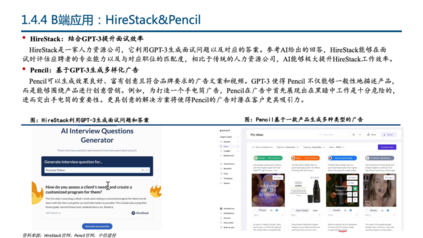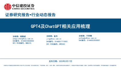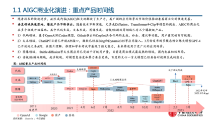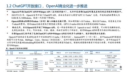 **2. GPT-4商业化进程加快。**GPT-4在发布时便开放了其纯文本输入的API,这与GPT-3和GPT-3.5的滞后开放不同。同时,GPT-4这次一起推出了6个商业场景的具体应用落地,在优化人机交互体验、提供专业服务、提升组织效能、文化传承与保护等方面都展现了巨大的潜能,未来有望看到更多场景中的商业化拓展与落地。 **3. ChatGPT已经刮起GPT生态狂潮。**2023年3月1号,OpenAI基于GPT 3.5 Turbo模型开放了ChatGPT API。API收费模式为0.002美元/1000tokens。相较于前一代开放接口GPT 3.5,性能更强的同时,价格下降90%,加速ChatGPT相关应用生态的发展。 **4.应用百花齐放,创造新的生产方式。**微软先后在搜索引擎Bing、企业服务平台Dynamic 365及开发者工具平台Power Platform等接入 ChatGPT/GPT-4能力。微软还发布了震撼的Microsoft 365 Copilot,极大提升office的生产力和交互方式。与此同时,在越来越多的企业宣布接入ChatGPT的能力,其中不乏一些已经取得优秀商业化的应用。如Jasper、Quizlet、Shop等,在语言文字创造、人机交互、教育、绘画、影音、零售等多场景落地应用。 5. 我们认为以GPT4/ChatGPT为代表的预训练大模型是这一轮AI浪潮的重要革新,重点推荐关注海内外优秀应用落地情况,AI芯片产业链等投资机遇。