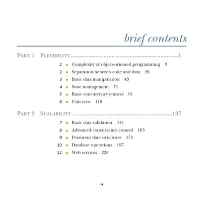 这本书讲述了一个故事,说明了面向数据编程(DOP)的价值,以及如何在现实生产系统中应用它的原则。我的建议是跟着故事走,按顺序读各个章节。然而,如果有些章节比其他章节更能激发你的好奇心,请注意,第一部分和第7部分的材料是需要理解第二和第三部分的。在本书中,我们使用Lodash (https://lodash.com/)来说明如何使用泛型函数操作数据。如果您正在阅读的代码片段使用的是您不熟悉的Lodash函数,您可以参考附录D来理解函数的行为。第1部分,灵活性,包含六个章节,重点介绍了传统面向对象编程(OOP)的挑战,并将面向数据编程(DOP)放在中心位置,揭示了如何使用DOP的基本原则来构建灵活的系统。这些章节是这样排列的: