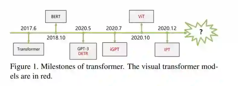 基于transformer的视觉模型如雨后春笋般涌现,这让我们很难跟上新发展的步伐。因此,对现有工作的调研是有益的,对社区是有益的。在本文中,我们对视觉transformer的最新进展进行了全面的概述,并讨论了进一步改进的潜在方向。为了获得更好的存档并方便不同主题的研究人员,我们按应用场景对transformer模型进行分类,如表1所示。具体来说,主要内容包括基本图像分类、高级视觉、低级视觉和视频处理。高级视觉处理图像中看到的东西的解释和使用[121],如对象检测、分割和车道检测。已经有许多transformer模型解决这些高级视觉任务,如DETR[14],用于目标检测的变形DETR[155]和用于分割的Max-DeepLab[126]。低级别图像处理主要涉及从图像(通常表示为图像本身)[35]中提取描述,其典型应用包括超分辨率、图像去噪和样式转换。很少有研究[17,92]在低级视觉中使用transformer,需要更多的研究。除了基于图像的任务外,视频处理也是计算机视觉的一个重要部分。由于视频的时序性,transformer自然可以应用于视频中[154,144]。与传统的CNN或RNNs相比,Transformer在这些任务上开始表现出具有竞争力的性能。本文对基于Transformer的可视化模型的研究工作进行了综述,以跟上这一领域的发展步伐。视觉Transformer的开发时间表如图所示,我们相信会有越来越多的优秀作品被镌刻在里程碑上。