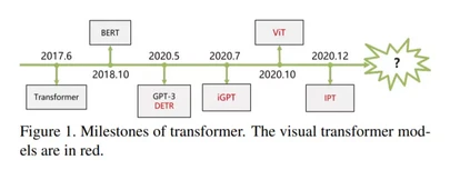 受自然语言处理中transformer 功能的启发,近年来研究人员将transformer 扩展到计算机视觉任务中。CNN曾经是视觉应用的基础组件[47,103],但transformer作为CNN的替代品正在表现出它的能力。Chen等人[18]训练序列转换器进行自回归预测像素,实现与CNN在图像分类任务上的相匹配结果。ViT是Dosovitskiy等人[31]最近提出的一种视觉transformer 模型,它将纯transformer 直接应用于图像贴片序列,在多个图像识别基准上获得了最先进的性能。除了基本的图像分类,transformer还被用于解决更多的计算机视觉问题,如目标检测[14,155]、语义分割、图像处理和视频理解。由于其优异的性能,越来越多的基于transformer的模型被提出用于改进各种视觉任务。