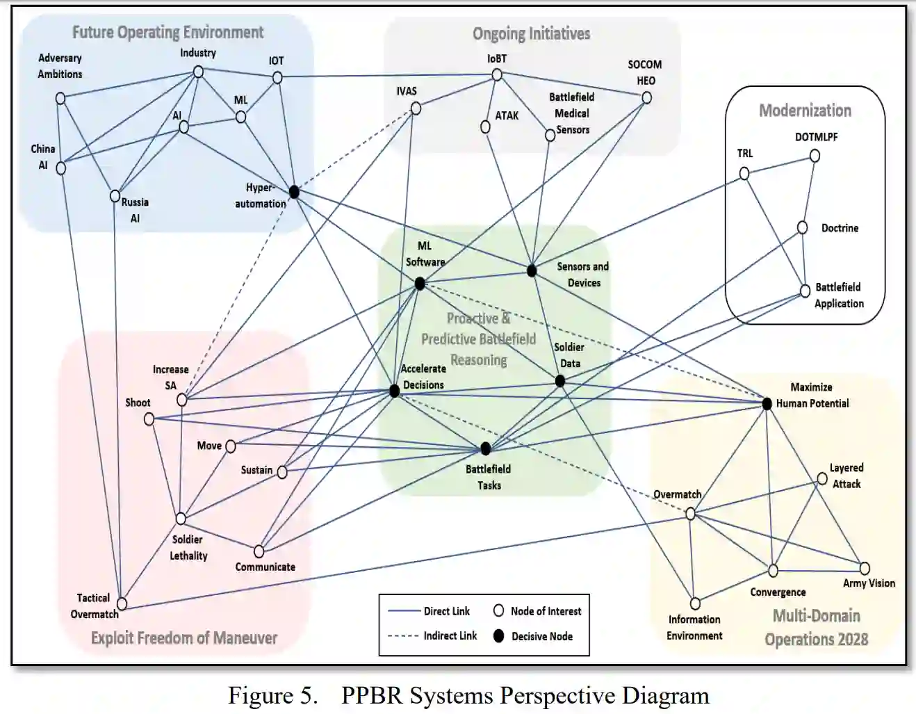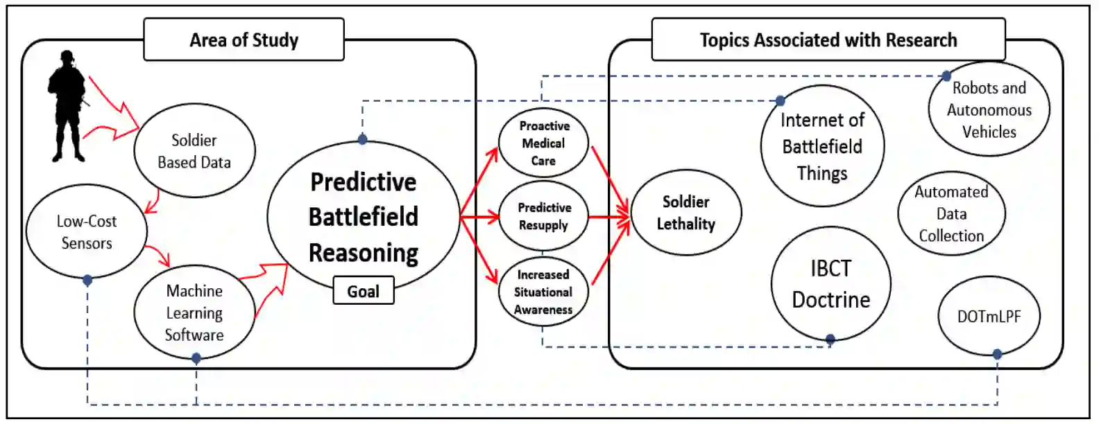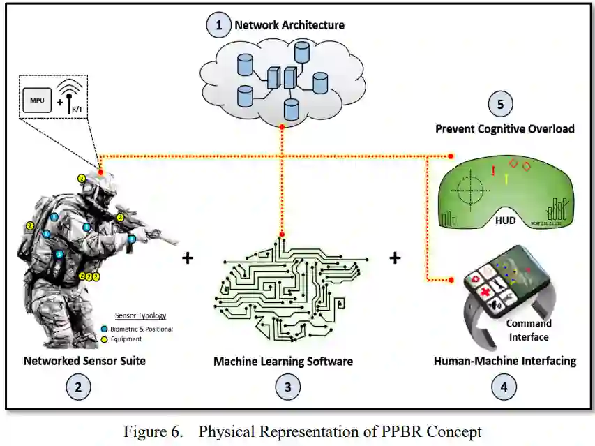 前瞻性和预测性战场推理(PPBR): 这一术语由作者创造,用于描述加快地面部队指挥官(GFC)和士兵在战场上做出和预测决策的速度所需的能力。根据设想,这一过程将通过可穿戴传感器或设备(机器)收集基于士兵的数据,使用 ML 软件对数据进行分析和综合,并以可消化的方式实时发布数据,以加速决策制定。