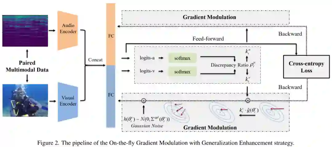 如上图(a)、(b)所示,audio-vision模型在VGGSound数据集的验证集上均逊于audio-only、vision-only这两个单一模态的模型。还有另一点值得注意的是,与audio-only模型相比,vision-only模型的准确度下降得更明显,这与 VGGSound (一个精心策划的面向声音的数据集)更喜欢音频模态的事实是一致的。一般来说,这样的数据集偏好通常会导致一种模态占主导地位,从而导致这种优化不平衡的现象。 为了解决上述问题,本文首先从优化的角度分析了模态间的贡献不平衡现象,发现性能更好的模态有助于降低联合判别损失,然后通过传播优于其他模态的梯度来主导优化过程。因此,本文提出了一种梯度控制模块来自适应地控制不同模态数据对损失函数和参数更新的贡献率。此外,本文提出在梯度中加入额外的动态高斯噪声能够避免梯度控制可能带来的泛化能力下降问题。 本文的主要创新点可以总结如下: * 发现了联合多模态模型的性能由于欠优化表示而受到限制的优化不平衡现象,然后从优化的角度对其进行了分析;