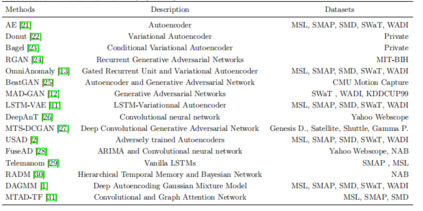 表1.1: 2018年至2021年同行评议的基于深度学习的多变量时间序列异常检测方法