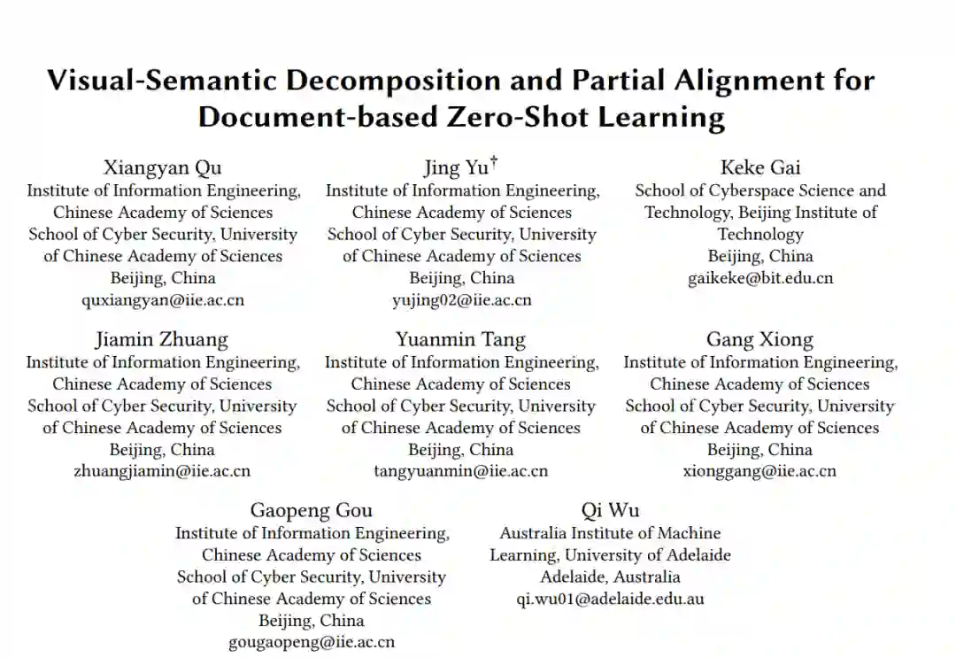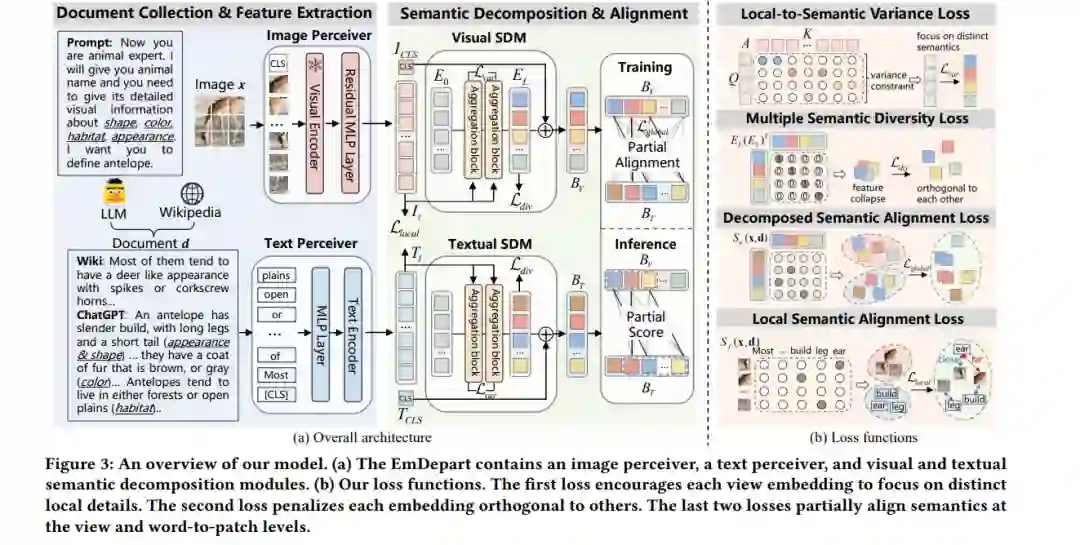 最近的研究表明,百科全书中的文档作为辅助信息对零样本学习非常有帮助。现有方法通过将整个文档的语义与相应的图像对齐来传递知识。然而,这些方法忽略了语义信息在两者之间并不等价,导致次优的对齐效果。在本研究中,我们提出了一种新颖的网络,从文档和图像中提取多视角的语义概念,并对匹配的部分概念进行对齐,而不是整个概念。具体来说,我们提出了一个语义分解模块,从视觉和文本方面生成多视角的语义嵌入,为部分对齐提供基本概念。为了缓解嵌入中的信息冗余问题,我们提出了局部到语义方差损失,以捕捉不同的局部细节,并提出多语义多样性损失,以在嵌入之间强制正交性。随后,引入了两种损失,根据它们在视图和词到片段级别的语义相关性,部分对齐视觉-语义嵌入对。因此,我们在三种标准基准测试的两个文档来源下,一直优于最新的方法。在定性方面,我们表明我们的模型学习到了可解释的部分关联。代码可在此获取。