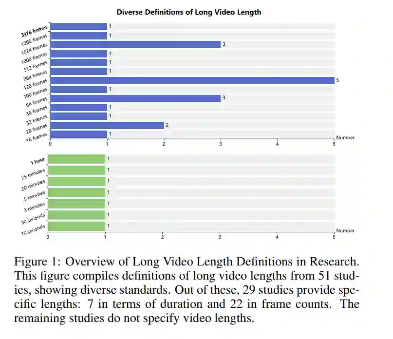 尽管如此,关于长视频生成的研究仍存在差距。当前研究中的一个缺口是缺乏长视频的标准定义。长短视频之间的区别通常依赖于不同工作中的相对度量,如帧数(例如,512,1024或3376帧)或持续时间(例如,3、5分钟),与较短视频(例如,30、48或64帧)相比。考虑到研究标准的多样性,我们在图1中总结了现有研究中声称的长视频生成的视频长度,基于此我们提出了长视频的定义。具体而言,如果视频的持续时间超过10秒,假设标准帧率为10fps,或者等价地,如果视频包含超过100帧,则将视频分类为“长”视频。这一定义旨在为各种研究背景中长视频的识别提供一个明确的基准。