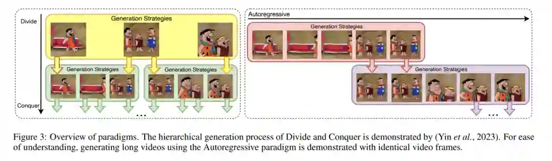 在长视频生成的领域中,有限的计算资源的挑战以及现有模型直接生成显著持续时间视频的能力不足,导致提出了两个不同的范式:分而治之和时间自回归,如图3所示。这些范式旨在将长视频生成的复杂任务解构为更易管理的过程,专注于创建单个帧或短片段,这些片段可以逻辑上组装以完成长视频的生成。 分而治之范式首先通过识别概述主要叙事的关键帧开始,然后生成介于关键帧之间的帧,以编织出一个连贯的长视频。另一方面,时间自回归范式,也简称为自回归,采用序列方法基于先前条件生成短视频段。这一范式旨在确保片段之间的流畅过渡,从而实现连续的长视频叙述。与分而治之采取层次化方法通过区分故事线关键帧和补充填充帧不同,时间自回归范式放弃了层次结构,转而专注于直接生成由前序帧信息指导的详细片段。 在这一部分,讨论集中在两个范式上,考察当前研究如何策略性地将长视频生成任务简化为更小、更易管理的任务。此外,它还突出了现有模型是如何被用于生成的,这些输出随后被组装成完整的视频叙述。