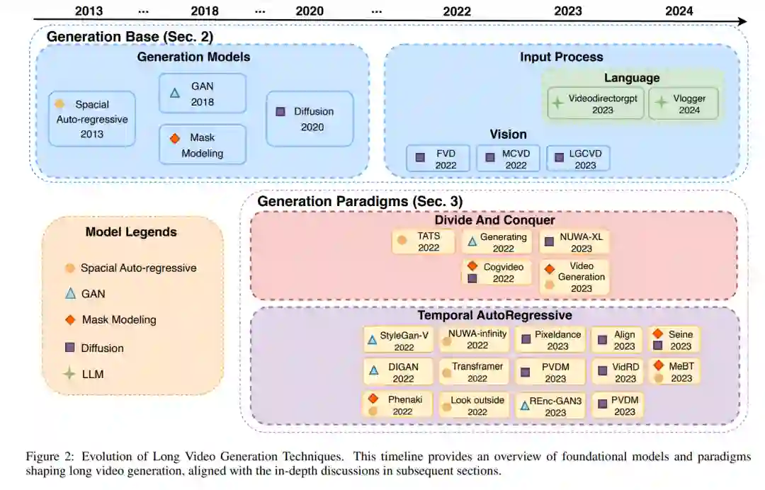 即便如此,长视频的生成仍面临诸多挑战。其核心是,长视频的固有多维复杂性对处理和生成的硬件资源提出了巨大的需求,导致训练和生成成本在时间和资源上的显著增加。这提出了在现有资源约束下生成长视频的挑战。此外,长视频数据集的稀缺性未能满足训练要求,阻止研究人员直接获得支持长视频模型生成的最优参数。在这种情况下,当生成的视频长度超过某些阈值时,难以保持长视频生成的时间一致性、连续性和多样性。此外,当前研究表面上出现了几种偏离现实世界既定物理定律的现象,提出了尚未被现有方法理解或直接操纵的未预见挑战。因此,长视频生成研究仍处于早期阶段,有许多挑战待解决,需要进一步的探索和发展。 在这项综述中,我们对长视频生成的现有研究进行了全面调查,旨在提供当前发展状态的清晰概述,并为其未来进展做出贡献。本文其余部分的组织概述在图2中。最初,我们在第1节中定义了长视频持续时间。第2节讨论了四种不同类型的视频生成模型和控制信号。根据第1节和第2节,我们在第3.1节和第3.2节中分别介绍了简化长视频生成任务的两种常见范式:分而治之和时间自回归。第4节和第5节讨论了视频质量改进和硬件要求。最后,本文以长视频生成的总结和对新兴趋势及机会的讨论结束。