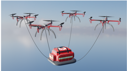 图 1.1: 多旋翼协同飞行器携带通过缆绳悬挂的应急包执行空中有效载荷操纵任务的示意图