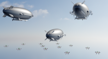 图 1.3:合作编队飞行任务示意图,多旋翼飞行器小组在飞艇的协助下作为领队节点引导编队飞行