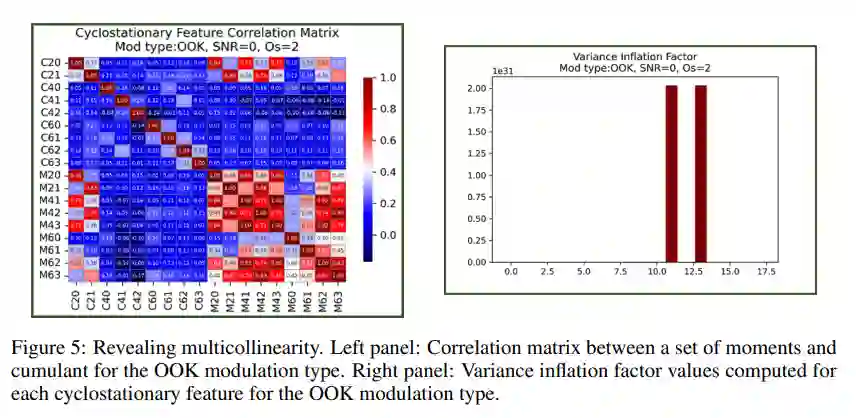高阶矩和累积量等循环平稳特征通常用于检测和分类数字调制信号。然而,这些预测变量可能并非相互不相关,这引起了人们对潜在多重共线性可能导致冗余信息并显着影响质量预测的担忧。本报告探讨了用于检测和减轻循环平稳特征中的多重共线性的机器学习和统计方法。我们的研究检查了九种信噪比上九种调制类型的合成电磁波对应的特征。实证结果表明,方差膨胀因子(VIF)方法和预测变量相关矩阵的特征分解在检测多重共线性方面是有效的。此外,使用主成分分析 (PCA) 技术进行特征转换使我们能够识别对预测模型性能影响较小的主成分。