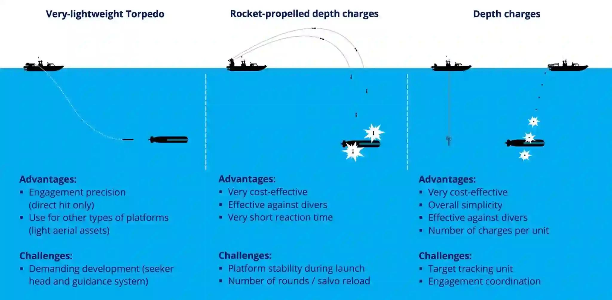 除了精致的微型鱼雷外,还有一种火箭推进深水炸弹。这种深水炸弹射程远、火力强,而且价格更低廉。俄罗斯和一些前东欧国家仍有装备这种几乎过时的反潜武器的军舰,但它们可能已经找到了新的作用。标准重力深水炸弹如今已很少使用,但也可能提供一种有前途的解决方案。由于传统重力式深水炸弹很重,不适合从小型 USV 或航空飞行器上大量部署,因此需要新一代小型深水炸弹。BAE 系统公司的新一代深水炸弹概念是目前正在开发的一种解决方案。