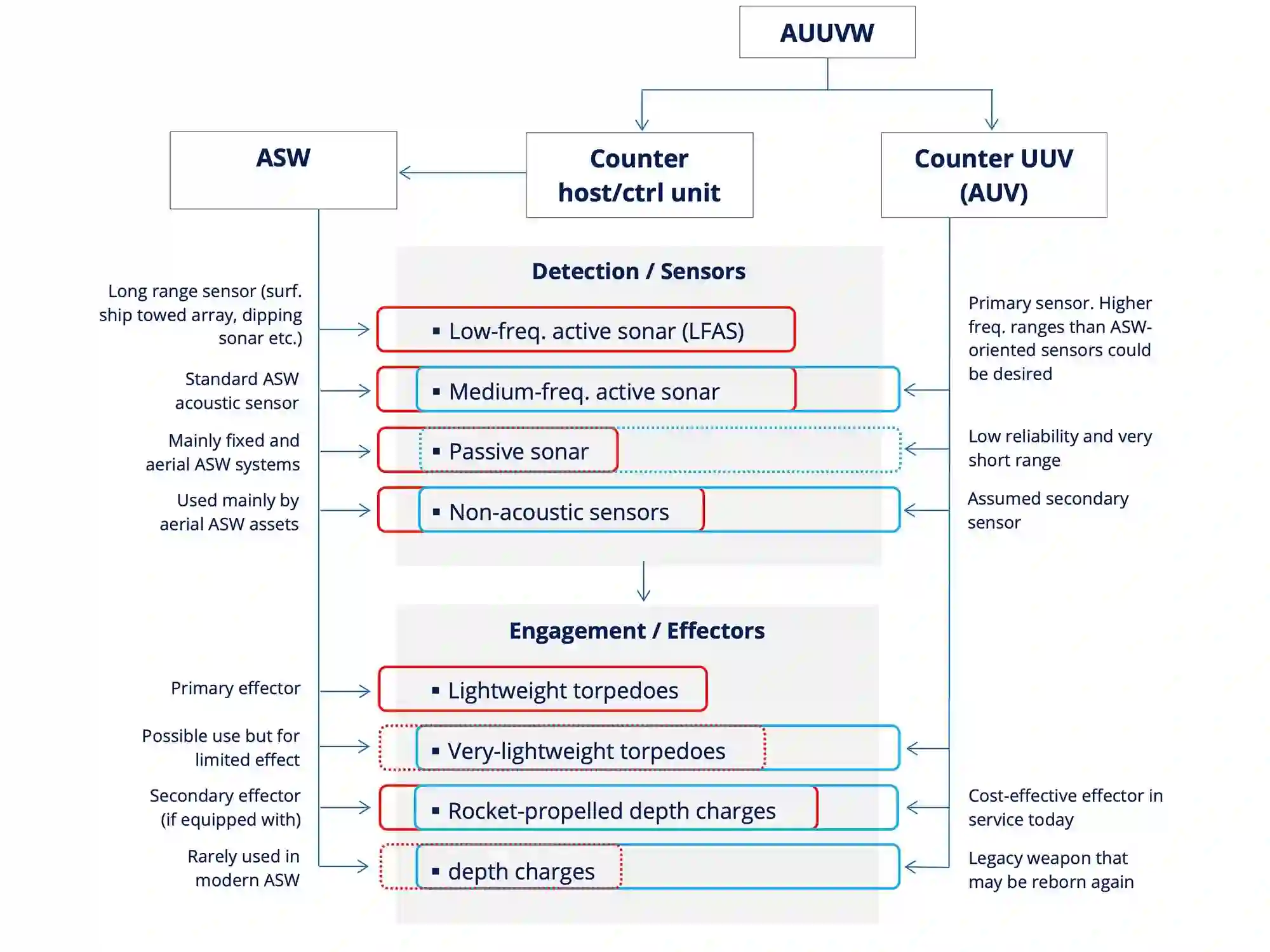 下图概述了监视和中和因素,并对典型的反潜和近未来的 AUUVW 进行了简短比较。这两个领域在传感器和效应器方面有许多共同之处,但在探测概率和武器使用方面存在显著差异和限制。