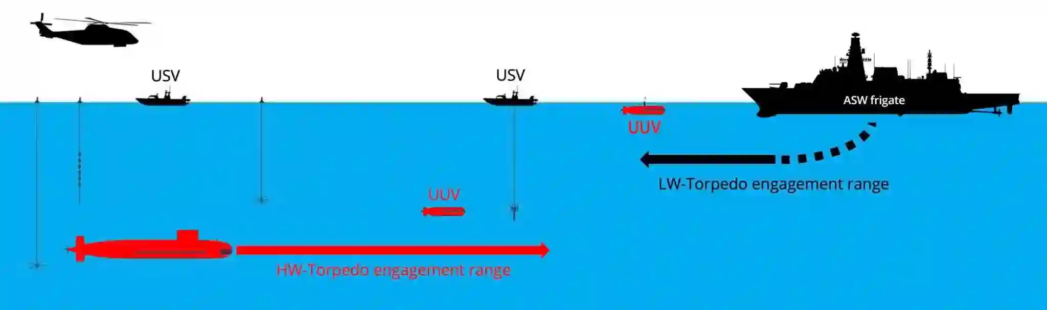 在未来的反潜任务中,反制 XLUUV 极有可能成为首要目标。在其他情况下,同样的资产将被部署到敌方行动区或其领海进行探测,AUUVW 的重要性可能与今天的反潜任务相同。双方都使用自主或无人系统的对峙行动使 USV 和航空平台成为执行 AUUVW 任务的天然候选者。