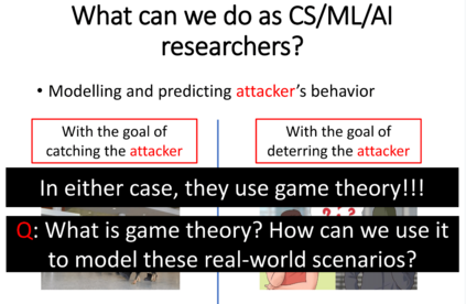 简介: 计算博弈论的一个中心问题是对给定游戏描述的博弈理论解概念进行计算。 在许多实际的多代理域中,包括基础结构安全性,环境保护,电子商务和网络路由,每个代理都需要做出由多个组件组成的复杂决策,例如选择网络中的路径,选择子集。 保护/攻击目标,为每个巡逻单位执行巡逻路线,多次竞标或在连续区域采取行动。 最终的策略空间可能由指数数量甚至是无限数量的纯策略组成,因此标标准形式表示及其相关算法存在不足。 本教程将总结具有复杂策略空间的游戏开发高效算法的最新进展,包括使用边际概率,用于表示和求解具有结构化策略空间的游戏的通用框架,以及使用可区分学习和(多主体)深度强化学习。 我们将涵盖从基础架构安全到环境和野生动植物保护的应用领域。