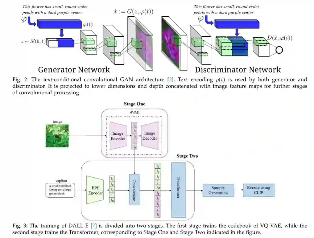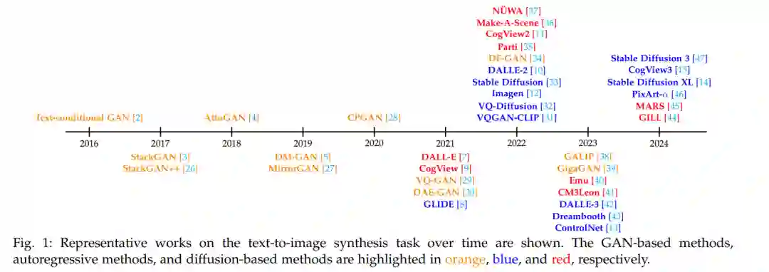 文本和图像是记录客观世界的基本手段。正如谚语所说:“一图胜千言”。当我们阅读纯文本时,往往会在脑海中形成相应的图像,帮助我们更好地理解内容。在计算机领域,文本到图像生成(T2I)[1],[2],[3],[4],[5],[6],[7],[8],[9],[10],[11],[12],[13],[14],[15]结合了自然语言处理(NLP)[16],[17],[18]和计算机视觉(CV)[19],[20],[21],指的是利用特定模型从文本描述中生成逼真图像的过程。由于其在多个领域革命性地改变内容创作的潜力,T2I受到了广泛关注。通过将文本描述转化为视觉内容,这项技术架起了语言与图像之间的桥梁,为艺术、设计和多媒体应用开辟了新的可能性。此外,T2I在人工智能生成内容(AIGC)[22]中扮演着重要角色,并且是走向通用人工智能的一个重要里程碑[23],[24],[25]。图1展示了T2I领域的一系列代表性作品。 随着深度学习[48]的进展,T2I模型已经能够生成更精细的图像,能够更贴切地匹配文本描述。回顾T2I模型的发展历程,由Elman Mansimov团队提出的AlignDRAW[1]被认为是该领域的开创性工作。该模型通过引入注意力机制[49],有效地展示了生成图像与文本描述之间的关系,尽管在某些情况下生成图像的质量仍需改进。 生成对抗网络(GANs)[50]的引入为T2I带来了显著进展。在条件生成对抗网络(cGAN)[51]的启发下,Reed等人设计了GAN-CLS和GNA-INT模型[2],它们是首批将GAN应用于T2I任务的工作,展示了GAN在生成高质量、细节丰富的图像方面的优势。这一阶段标志着GAN在T2I中的应用取得了重要突破[3],[4],[34]。 利用来自NLP的Transformer架构[17],OpenAI推出了DALL-E模型[7]。该模型是首个采用自回归(AR)方法进行图像生成的模型,利用大规模数据集生成多样化的图像。尽管AR方法展示了高质量的生成能力[9],[35],[45],但其巨大的计算成本限制了其在某些应用场景中的实用性。 近年来,受到非平衡热力学启发的扩散模型(DM)[52],[53]逐渐成为T2I领域最先进的方法。GLIDE[8]是首个将扩散模型应用于T2I任务的工作,通过在像素空间中操作,展示了出色的生成能力。潜在扩散模型(LDM)[33]的引入突显了潜在空间在扩散模型中的重要性,显著提高了生成图像的质量。随着研究的深入,扩散模型展示了无与伦比的有效性[12],[13],[15],使其成为T2I研究中最受欢迎的方向之一。 T2I技术的持续进展激发了学术界的热烈讨论[54]。各研究团队不断发布新的论文,技术更新的快速步伐给新入门者带来了不小的挑战。当前的研究已经探索了GAN在T2I中的发展[55],[56]、扩散模型(DM)的进展[57],以及关于可控生成模块的相关工作[58]。然而,关于T2I最新方向的综合性综述仍然有限。为了帮助研究人员了解T2I的最新进展,本文将介绍GAN、AR和DM模型的基本原理,并对它们的进展进行详细回顾。此外,本文还将全面综述T2I的前沿研究方向,旨在为研究人员提供清晰的路线图和宝贵的参考,助力进一步探索。 本文结构如下:第2节介绍GAN、AR模型和扩散模型的数学原理和模型结构;第3节回顾这三种模型的发展历程,突出不同阶段的代表性工作,并解释它们的技术演变;第4节探讨T2I的最新研究方向,包括详细控制、可控T2I生成、个性化图像生成、一致性问题以及与安全性和版权保护相关的挑战;第5节描述T2I研究中常用的数据集和评估指标,并通过这些指标比较各种模型的效果;第6节介绍T2I的最新应用,突显其在AIGC中的重要性和潜在影响;最后,第7节总结T2I的研究成果,回顾过去的挑战,并讨论未来发展方向及进一步研究的建议。
