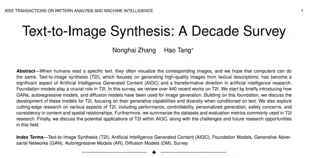 当人类阅读特定文本时,往往会将其与相应的图像进行联想,我们希望计算机也能做到这一点。文本到图像合成(T2I)旨在从文本描述中生成高质量的图像,已成为人工智能生成内容(AIGC)的一个重要方向,并且是人工智能研究中的一项变革性技术。基础模型在T2I中发挥着关键作用。本调查综述了超过440篇关于T2I的最新研究成果。我们首先简要介绍了生成对抗网络(GANs)、自回归模型和扩散模型在图像生成中的应用。在此基础上,我们讨论了这些模型在T2I中的发展,重点关注它们在文本条件下的生成能力和多样性。我们还探讨了T2I研究的前沿进展,涉及性能、可控性、个性化生成、安全性问题以及内容一致性和空间关系的保持等多个方面。此外,我们总结了T2I研究中常用的数据集和评估指标。最后,我们讨论了T2I在AIGC中的潜在应用,以及该领域面临的挑战和未来的研究机会。