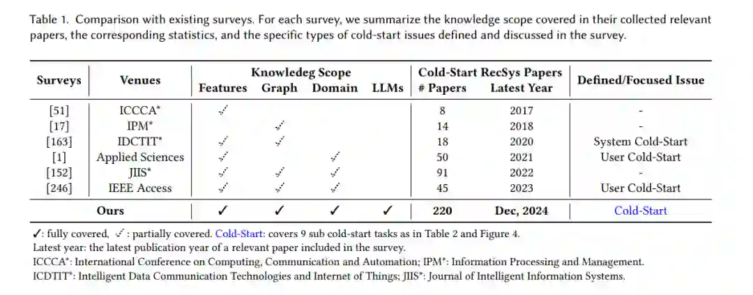 表1展示了我们综述与之前综述之间的比较。现有的所有综述仅关注冷启动推荐问题的部分知识范围或有限方面。最早的综述【51】和【17】部分覆盖了单一知识范围,但没有明确界定具体的冷启动问题。随后,IDCTIT【163】和《Applied Sciences》【1】等的综述开始结合图谱关系和领域信息,并首次明确界定了系统冷启动和用户冷启动问题,涵盖了2021年前相关文献。更近的综述,如《JIIS》【152】和《IEEE Access》【246】扩大了覆盖的范围和文献数量,特别是【246】重点关注用户冷启动问题。总体来说,现有文献中没有任何一篇综述全面覆盖所有四个方面(特征、图谱、领域和LLMs),并同时处理多个冷启动问题。在本文中,我们旨在填补这一空白,提供一篇全面且系统的综述,涵盖220篇文献,明确界定9个不同的冷启动问题,并结合特征、图谱、领域和LLMs的知识范围进行分析。