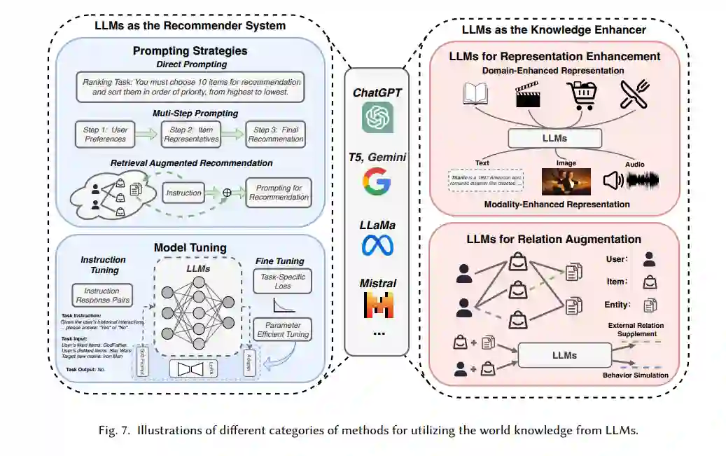 大语言模型(LLMs)是通过深度学习技术训练的生成型人工智能系统,旨在通过学习大量文本语料数据来理解一般的世界知识。这些模型能够生成文本、回答问题、进行翻译,甚至参与复杂的对话【271, 287】。由于近年来取得的巨大成功,越来越多的领域开始利用大语言模型的能力来完成各种任务,如多模态学习【217】、图学习【159】和推荐系统【219】,并取得了显著成果。由于大语言模型强大的文本特征处理能力,冷启动,尤其是零样本和少样本场景,已成为大语言模型在推荐领域中的一个重要应用。根据大语言模型所扮演的角色,我们将现有的研究工作分为两个主要方面:大语言模型作为推荐系统(第6.1节)和大语言模型作为知识增强器(第6.2节)。