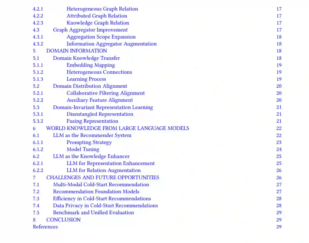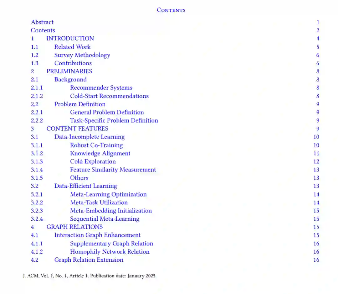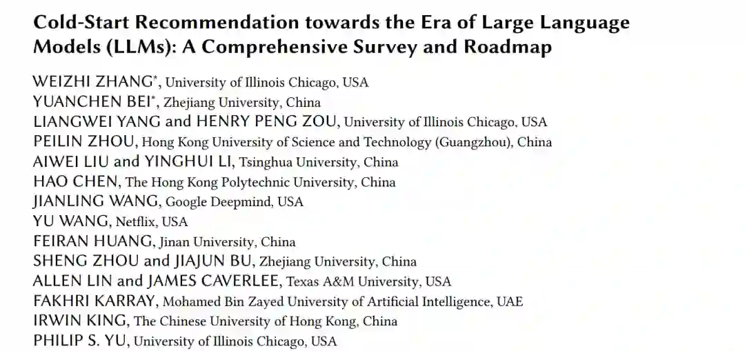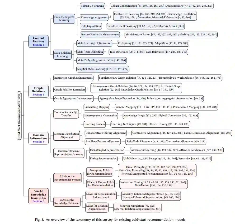 在本文中,我们对冷启动推荐进行了全面的综述,并提出了一条从内容特征、图关系、领域信息到大语言模型世界知识的研究路线图。具体而言,我们首先正式定义了冷启动推荐领域的不同研究问题,然后系统性地回顾了冷启动推荐的研究进展。在每个部分中,我们不仅总结了相关研究背后的核心洞见,还列举了一些代表性工作,以帮助读者更好地理解。此外,我们重新审视了冷启动推荐的一些关键挑战,并总结了一些有意义的未来研究方向。相关资源已整理至Github:https://github.com/YuanchenBei/Awesome-Cold-Start-Recommendation),供研究社区参考。