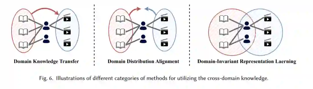 在现实世界的在线应用中,只有少数平台能够实现显著的用户参与,而许多其他平台则面临持续的长尾问题和用户冷启动问题。因此,跨域迁移学习【213, 290】提供了一个有前景的解决方案,通过利用源域中丰富的数据知识来增强目标域中信息有限的推荐性能。与传统的冷启动推荐系统不同,跨域推荐方法本质上更为复杂。它们必须考虑来自至少两个不同系统的知识,而这些系统之间通常存在显著差异。这些方法通常需要跨域环境中有重叠的用户,并且需要有效的策略来利用这些用户共享域知识。根据利用域知识的高层次方法,我们将现有的研究工作分为三类:域知识迁移(第5.1节)、域分布对齐(第5.2节)和域不变表示学习(第5.3节),如图6所示。