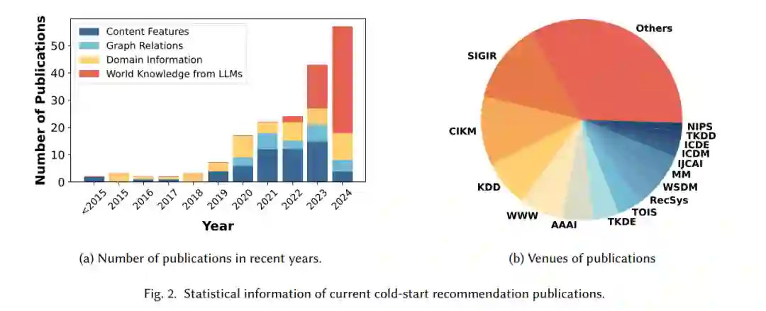 本文旨在提供对冷启动推荐领域最前沿技术和框架的全面综述,特别关注大语言模型时代下知识范围扩展的方向,如图1所示。本文特别关注发表在顶级会议和期刊中的相关工作,如图2b所示。基于这些工作,我们将现有研究按照外部知识源的规模分为四个知识范围:内容特征、图谱关系、领域信息和大语言模型的世界知识。通过系统地分类和分析这些方法,本文综述旨在呈现对冷启动推荐领域的全面理解,并提出未来研究的路线图。我们强调将大语言模型整合到冷启动推荐中的变革潜力,并概述了这一新兴领域未来可能面临的机遇和挑战。