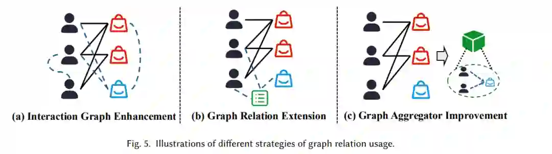 图关系提供了高阶信息,而不仅仅是用户/物品本身的内容特征。利用图关系知识能够将邻域中的信息传播到特定的用户或物品。然而,该领域的关键挑战在于如何为冷启动用户/物品提供图信息,因为缺乏历史交互数据。首先,这里简要介绍一下图神经网络(GNNs),它们在本节被广泛用于图关系推理: 近年来,图神经网络(Graph Neural Networks, GNNs)受到了极大的关注,并在许多图挖掘任务中展示了最前沿的性能,如节点分类【9, 55, 100】、链接预测【223, 248, 254】和图分类【210, 211, 229】等。GNNs通常采用消息传递(message-passing)范式,通过聚合邻域信息来更新每个中心节点的嵌入表示。作为链接预测任务的一部分,推荐系统近年来涌现出大量基于GNN的推荐模型,并取得了显著的推荐效果【64, 204, 232】。基于GNN的推荐模型主要利用GNN强大的消息传递机制,在图结构中建模用户-物品交互,从而更好地理解用户偏好和物品相关性,并利用高阶信息实现更有效的推荐【24, 165, 220】。