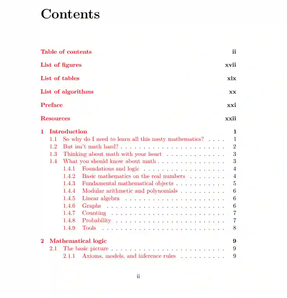 这是一门计算机科学中使用的离散数学课程。由于这只是一个学期的课程,因此它涵盖的主题相对较少,或者没有深入探讨。但是,课程的目的是为你打下一个可以根据需要进一步发展的基础,特别是为了让你具备一定的数学成熟度——即对数学的基本理解,以及数学定义和证明的工作原理。
