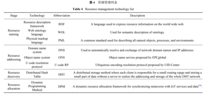 元宇宙,本质上就是广义网络空间[7,49],在涵盖物理空间、社会空间、赛博空间及思维空间的基础上,共享资源。资源管理主要包括资源描述、资源寻址、资源发现和资源分配等,以满足元宇宙的低延迟、高度沉浸等需求。目前,在资源管理的四个典型阶段上已经有了一些较为成熟的技术,如表4 所示。