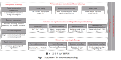 元宇宙管理技术保障虚拟空间(即赛博空间)与真实空间(含物理空间、社会空间及思维空间)的泛在连接与空间融合所需要的软硬件环境,主要包括能耗管理、资源管理、会话管理、时空一致性管理等。