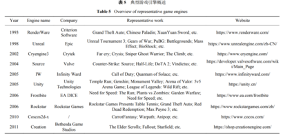 电子游戏技术,是元宇宙的最直观的表现方式,不仅可以为元宇宙提供内容创作平台,还可以实现娱乐、社交场景的聚合。元宇宙产品实质是游戏的泛化(娱乐游戏、严肃游戏等),比如,美国著名歌手Travis Scott在《堡垒之夜》举办元宇宙演唱会;GUCCI与Roblox推出的“元宇宙GUCCI品牌展览会”;欧莱雅发布的全球首个品牌虚拟代言人“M姐”等等。游戏开发中,最重要的是游戏引擎,类似于制造机床的母机床,这也将是大规模元宇宙平台的“卡脖子”技术之一。游戏引擎的出现降低了游戏设计者及开发者建立虚拟场景的难度,使他们无需从基础的代码做起。其发展决定了元宇宙中NPC建模、场景实时渲染、用户操作与交互等方面的质量及性能,让用户有更加接近于真实世界的体验。目前,比较知名的游戏引擎如表5 所示。