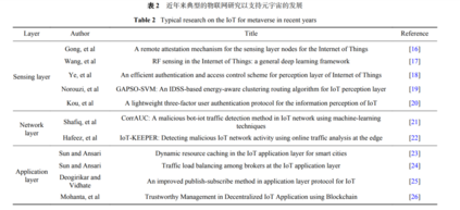 物联网(Internet of Things, IoT)在元宇宙的网络基础设施的实现和发展中将发挥重要作用。虚拟世界与现实世界的泛在连接,离不开大量传感器、智能终端等物联网设备实时采集和处理数据,故物联网可为用户提供真实、持久且顺畅的交互体验,是虚拟世界与现实世界的联接和桥梁。物联网经典的三层架构,即感知层、网络层和应用层,与元宇宙的建立紧密联系。表2 列举了近年来部分学者对物联网三层架构的研究成果,将来为物联网技术在元宇宙中的应用做好铺垫,支撑元宇宙的发展。