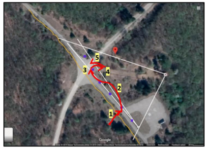 图2:指导动作(红线),扮演一个非法越境的场景:1.一个人通过步行越过边境。2.该人沿着边境小路向大路走去。3.此人停下脚步,在路上停留很长时间(可能是在等待汽车中的走私者)。4.在某一时刻离开道路,躲进树丛中。5. 在树叶中,该人再次回到路上(可能再次寻找汽车)
