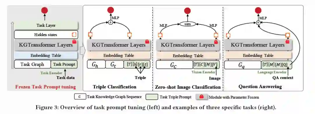 为了解决这个问题,预训练的KG模型被提出来学习实体和关系的通用嵌入表示,可以应用于许多任务。这些嵌入被认为包含实体相似性、层次结构和关系等信息,可用于推荐系统、实体对齐、问答等任务,有助于隐式访问知识图谱中的知识。然而,这种方式面临两个挑战:(1)第一个挑战是,如果任务知识图谱与预训练知识图谱包含不同的实体和关系,则基于嵌入的方法由于嵌入缺失而无法将有价值的信息传递给下游任务模型。(2)第二个挑战是知识图谱和任务数据之间缺少基本的交互和融合,使得融合模块的设计成为下游任务模型设计的一部分。因此,基于嵌入的知识图谱模型并不是KRF模块跨知识图谱相关任务的理想解决方案。KGTransformer通过对KG结构进行预训练,并将与特定实体和关系无关的参数转换到下游任务来解决第一个挑战。本文通过提示调优机制解决第二个挑战,以实现KGs和任务数据之间的统一和灵活融合。